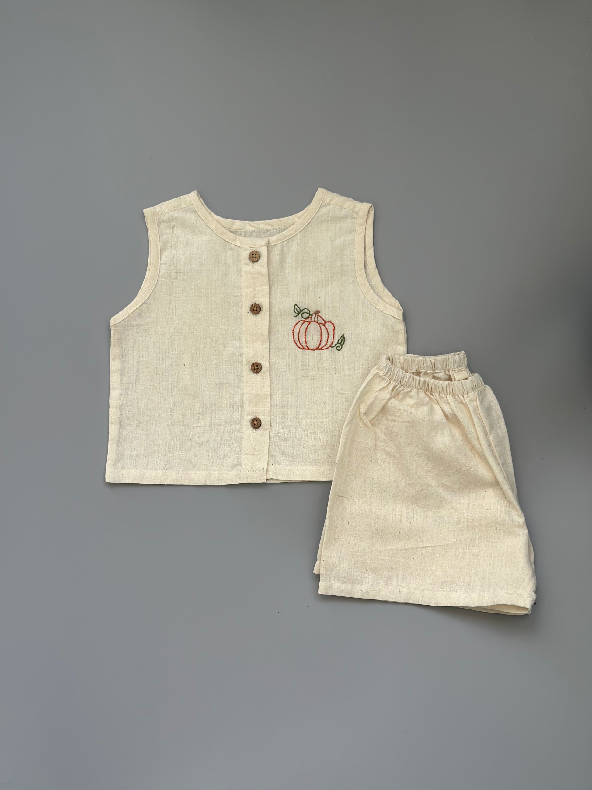 Sweet, simple, and oh-so-snug! This handloom toddler coord set comes in a soft natural shade with an adorable pumpkin embroidery that adds a playful charm. Crafted from pure, breathable handloom fabric, it keeps your little one comfy through every wiggle, crawl, and cuddle.